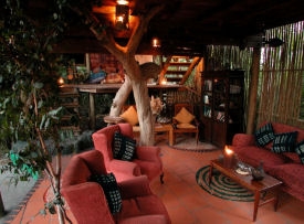 - on an elevated wooden deck between two magnificent sycamore fig trees